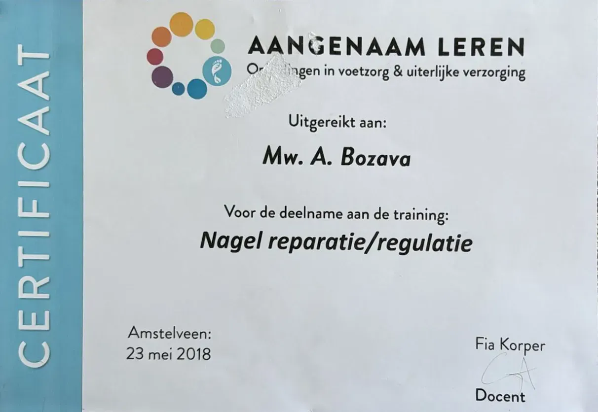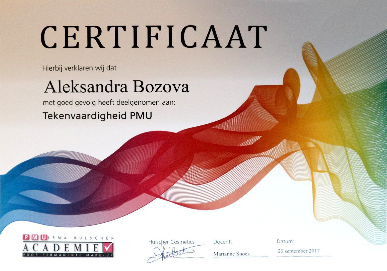 Naast het diploma PMU heb ik mij verder verdiept in voetverzorging. Bij Aangenaam Leren in Amstelveen volgde ik de pedicureopleiding, waarmee ik naast Aleksandra Microblading ook Aleksandra Voetverzorging heb opgericht. Mijn interesse in menselijk gedrag en innerlijke processen bracht mij vervolgens bij de driejarige opleiding Jungiaanse Psychologie bij Karin Hamaker-Zondag in Amstelveen. Deze kennis gebruik ik dagelijks in mijn werk om de mens achter het gezicht of de voeten écht te zien en te begrijpen.